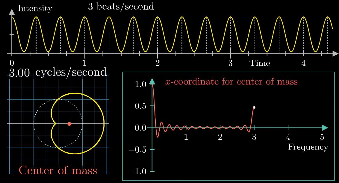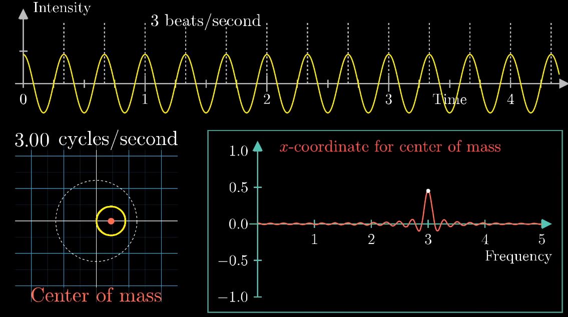 The center of mass is much away when the sampling frequency is the same as signal's.