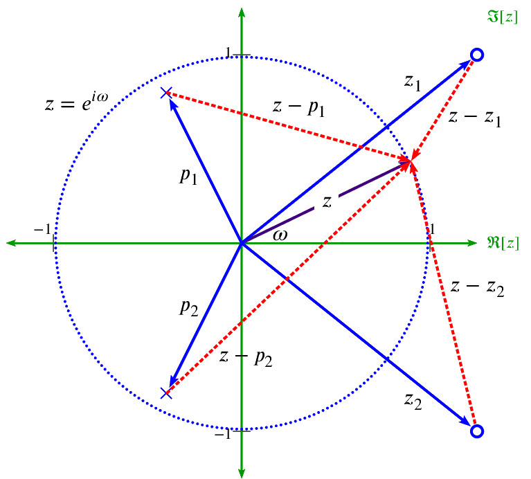 The frequency response of a filter is determined by the interaction of a unit vector rotating around the unit circle with the poles and zeros of the filter.