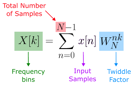 \(X_n=\sum_{k=0}^{\frac N2-1}x_{2n}⋅e^{\frac{-i⋅2\pi⋅k⋅n}{N/2}}+e^{\frac{-i⋅2\pi⋅n}N}\sum_{k=0}^{\frac N2-1}x_{2n+1}⋅e^{\frac{-i⋅2\pi⋅k⋅n}{N/2}}\)