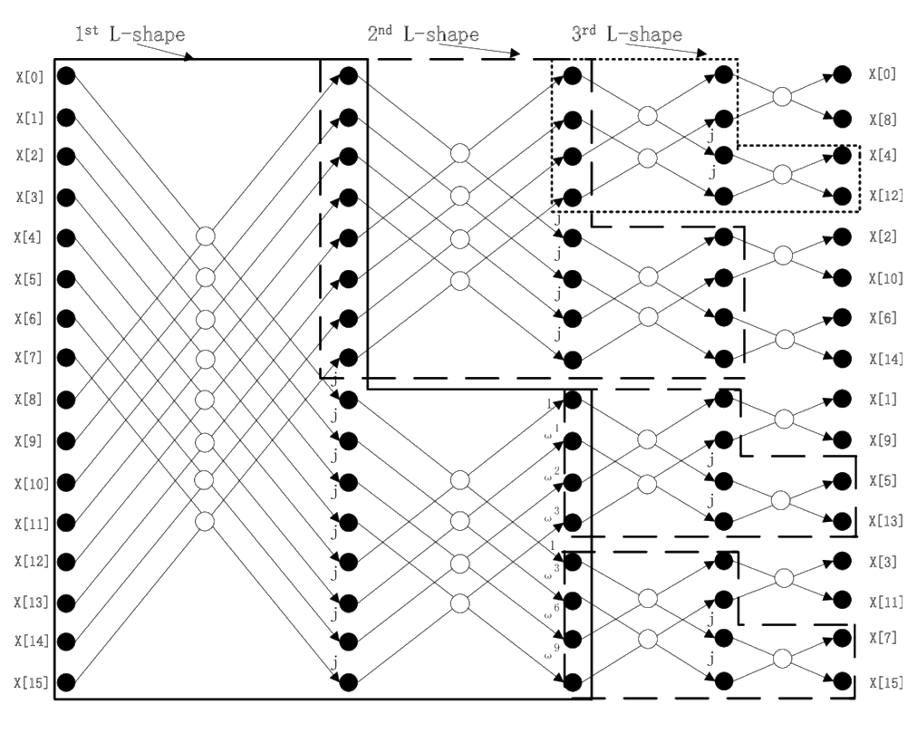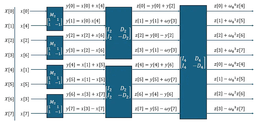 \(\begin{bmatrix}X\lbrack0\rbrack\\X\lbrack1\rbrack\\X\lbrack2\rbrack\\X\lbrack3\rbrack\\X\lbrack4\rbrack\\X\lbrack5\rbrack\\X\lbrack6\rbrack\\X\lbrack7\rbrack\end{bmatrix}=\begin{bmatrix}I_4&D_4\\I_4&-D_4\end{bmatrix}\begin{bmatrix}I_2&D_2&0_{2,2}&0_{2,2}\\I_2&-D_2&0_{2,2}&0_{2,2}\\0_{2,2}&0_{2,2}&I_2&D_2\\0_{2,2}&0_{2,2}&I_2&-D_2\end{bmatrix}\begin{bmatrix}M_2&0_{2,2}&0_{2,2}&0_{2,2}\\0_{2,2}&M_2&0_{2,2}&0_{2,2}\\0_{2,2}&0_{2,2}&M_2&0_{2,2}\\0_{2,2}&0_{2,2}&0_{2,2}&M_2\end{bmatrix}\begin{bmatrix}x\lbrack0\rbrack\\x\lbrack1\rbrack\\x\lbrack2\rbrack\\x\lbrack3\rbrack\\x\lbrack4\rbrack\\x\lbrack5\rbrack\\x\lbrack6\rbrack\\x\lbrack7\rbrack\end{bmatrix}\)