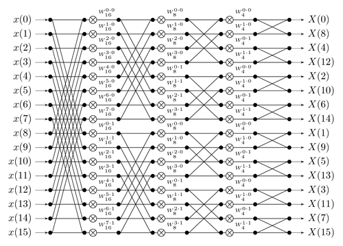 \(\begin{bmatrix}P_4&0_{4,4}\\0_{4,4}&P_4\end{bmatrix}\begin{bmatrix}x\lbrack0\rbrack\\x\lbrack2\rbrack\\x\lbrack4\rbrack\\x\lbrack6\rbrack\\x\lbrack1\rbrack\\x\lbrack3\rbrack\\x\lbrack5\rbrack\\x\lbrack7\rbrack\end{bmatrix}=\begin{bmatrix}1&0&0&0&0&0&0&0\\0&0&1&0&0&0&0&0\\0&1&0&0&0&0&0&0\\0&0&0&1&0&0&0&0\\0&0&0&0&1&0&0&0\\0&0&0&0&0&0&1&0\\0&0&0&0&0&1&0&0\\0&0&0&0&0&0&0&1\end{bmatrix}\begin{bmatrix}x\lbrack0\rbrack\\x\lbrack2\rbrack\\x\lbrack4\rbrack\\x\lbrack6\rbrack\\x\lbrack1\rbrack\\x\lbrack3\rbrack\\x\lbrack5\rbrack\\x\lbrack7\rbrack\end{bmatrix}=\begin{bmatrix}x\lbrack0\rbrack\\x\lbrack4\rbrack\\x\lbrack2\rbrack\\x\lbrack6\rbrack\\x\lbrack1\rbrack\\x\lbrack5\rbrack\\x\lbrack3\rbrack\\x\lbrack7\rbrack\end{bmatrix}\)