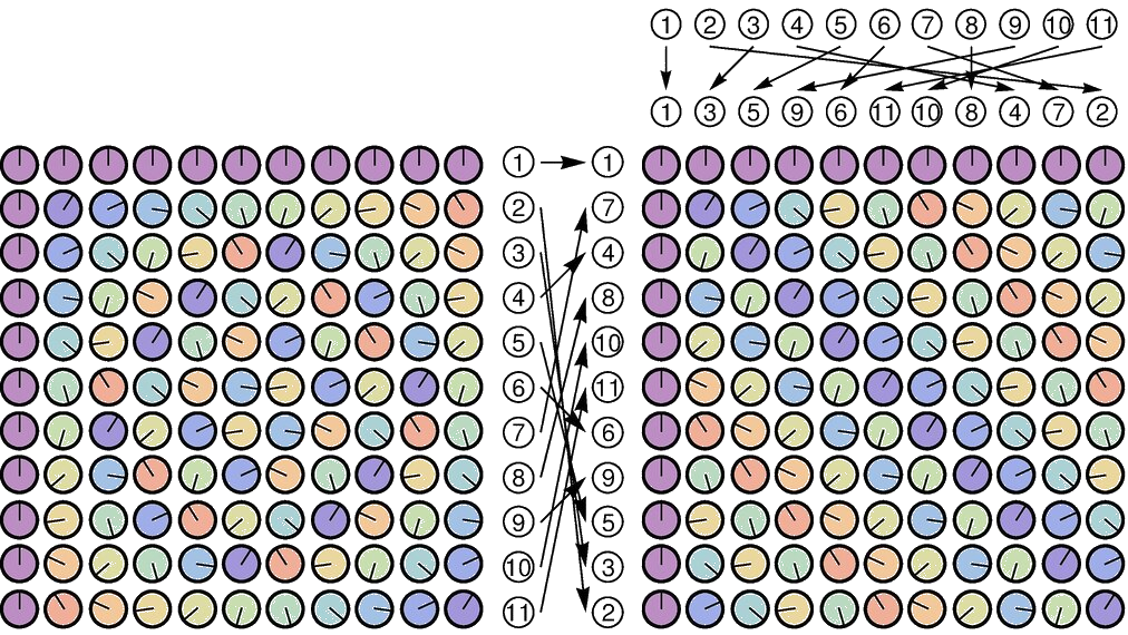 \(P_8\begin{bmatrix}x\lbrack0\rbrack\\x\lbrack1\rbrack\\x\lbrack2\rbrack\\x\lbrack3\rbrack\\x\lbrack4\rbrack\\x\lbrack5\rbrack\\x\lbrack6\rbrack\\x\lbrack7\rbrack\end{bmatrix}=\begin{bmatrix}1&0&0&0&0&0&0&0\\0&0&1&0&0&0&0&0\\0&0&0&0&1&0&0&0\\0&0&0&0&0&0&1&0\\0&1&0&0&0&0&0&0\\0&0&0&1&0&0&0&0\\0&0&0&0&0&1&0&0\\0&0&0&0&0&0&0&1\end{bmatrix}\begin{bmatrix}x\lbrack0\rbrack\\x\lbrack1\rbrack\\x\lbrack2\rbrack\\x\lbrack3\rbrack\\x\lbrack4\rbrack\\x\lbrack5\rbrack\\x\lbrack6\rbrack\\x\lbrack7\rbrack\end{bmatrix}=\begin{bmatrix}x\lbrack0\rbrack\\x\lbrack2\rbrack\\x\lbrack4\rbrack\\x\lbrack6\rbrack\\x\lbrack1\rbrack\\x\lbrack3\rbrack\\x\lbrack5\rbrack\\x\lbrack7\rbrack\end{bmatrix}\)