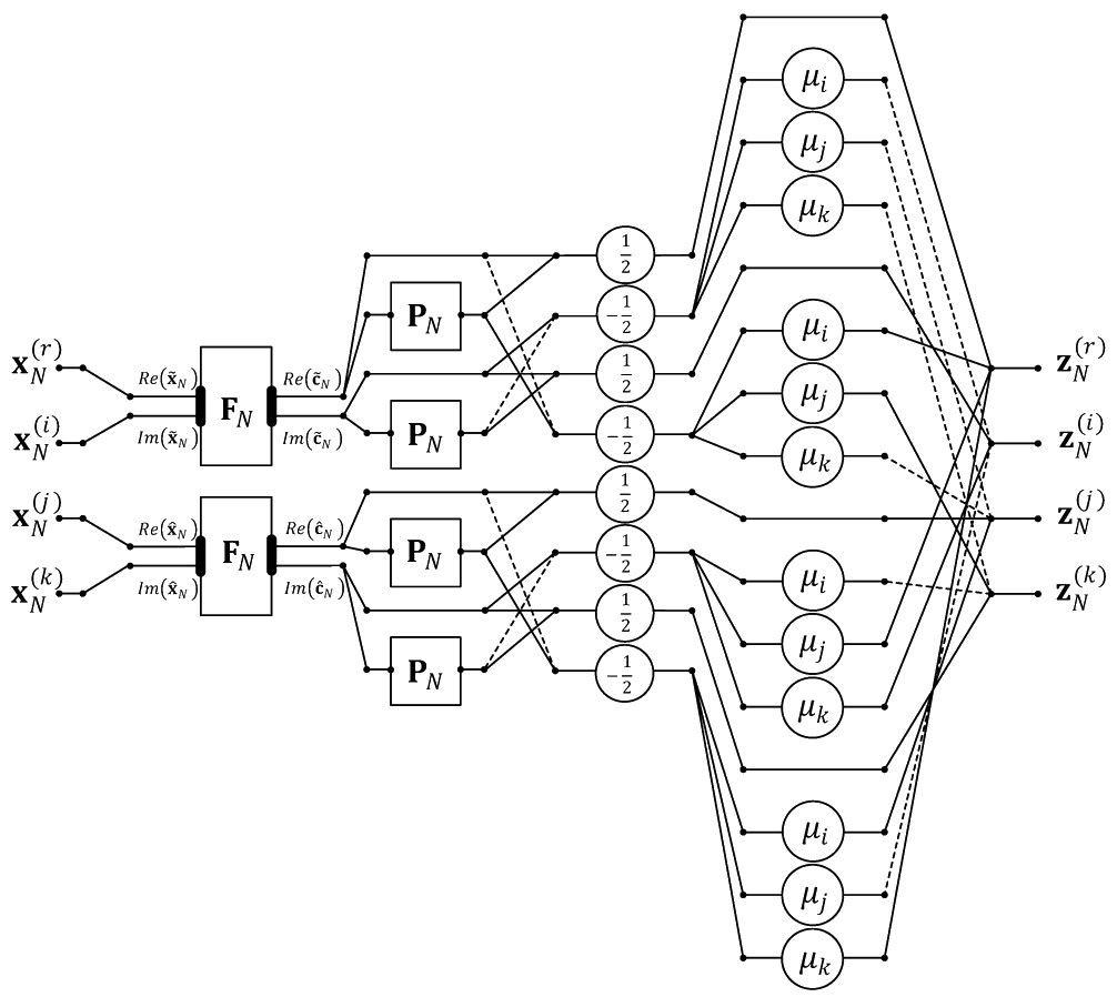 \(\Rightarrow\begin{bmatrix}X(0)\\X(1)\\X(2)\\X(3)\end{bmatrix}=\begin{bmatrix}I_2&D_2\\I_2&-D_2\end{bmatrix}\begin{bmatrix}M_2&0\\0&M_2\end{bmatrix}P_4\begin{bmatrix}x(0)\\x(1)\\x(2)\\x(3)\end{bmatrix}\)
