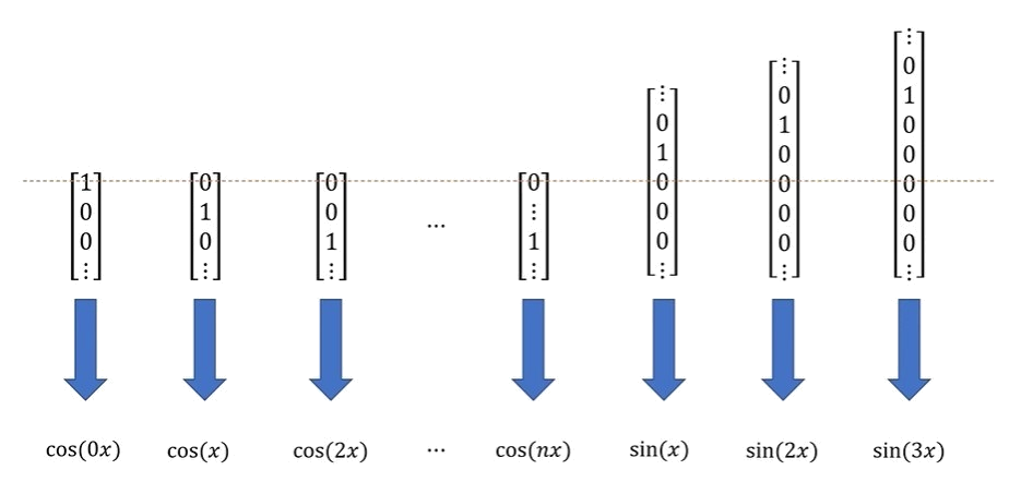 \(\underbrace{1,\;\cos(x),\;\sin(x),\;\cos(2x),\;\sin(2x),\;\cdots}_{non\;standard\;basis}\;\Rightarrow\underbrace{\frac1{\sqrt{2\pi}},\;\;\frac{\cos(x)}{\sqrt\pi},\;\frac{\sin(x)}{\sqrt\pi},\;\frac{\cos(2x)}{\sqrt\pi},\;\frac{\sin(2x)}{\sqrt\pi},\;\cdots}_{standard\;basis}\)