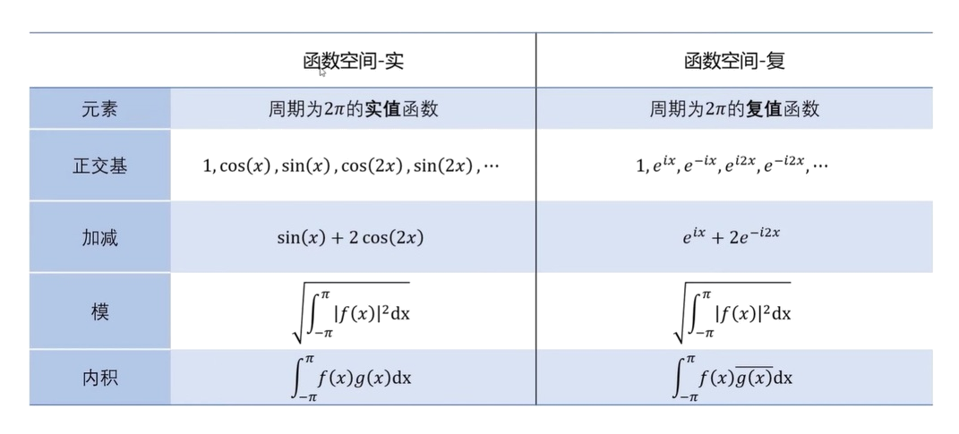 \(e^{inx}\rightarrow\left\{\begin{array}{lcc}n=0&f(x)=e^0=1&\\n=1&f(x)=e^{ix}&T=2\pi,\;\left\|f(x)\right\|=1\\n=2&f(x)=e^{i2x}&T=\pi,\;\left\|f(x)\right\|=1\\n=-1&f(x)=e^{-ix}&T=2\pi,\;\left\|f(x)\right\|=1\end{array}\right.\)