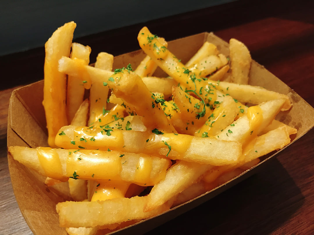 烤箱預熱至200度,放上冷凍薯條,均勻擺在烤盤上,再灑上起司(可加入培根),烘烤一會,均勻灑上海鹽、胡椒粉與巴西里(Parsley)增添香氣,熱騰騰的起司融化香味四溢,搭配啤酒也是一絕。