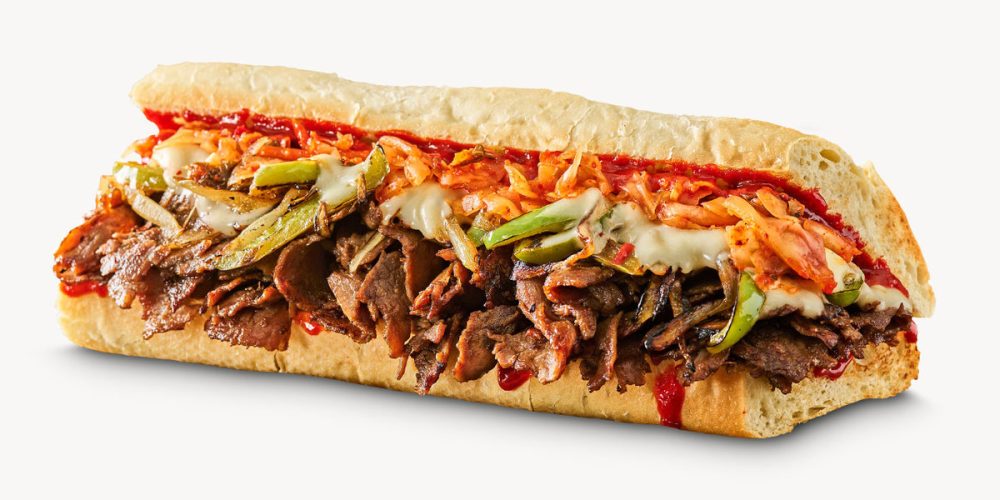 費城泡菜堡(Kimchi Philly): 堆滿薄牛排,上面撒上韓國辣味辣椒醬、濃郁的泡菜、融化的美國白起司,以及炒青椒和洋蔥。